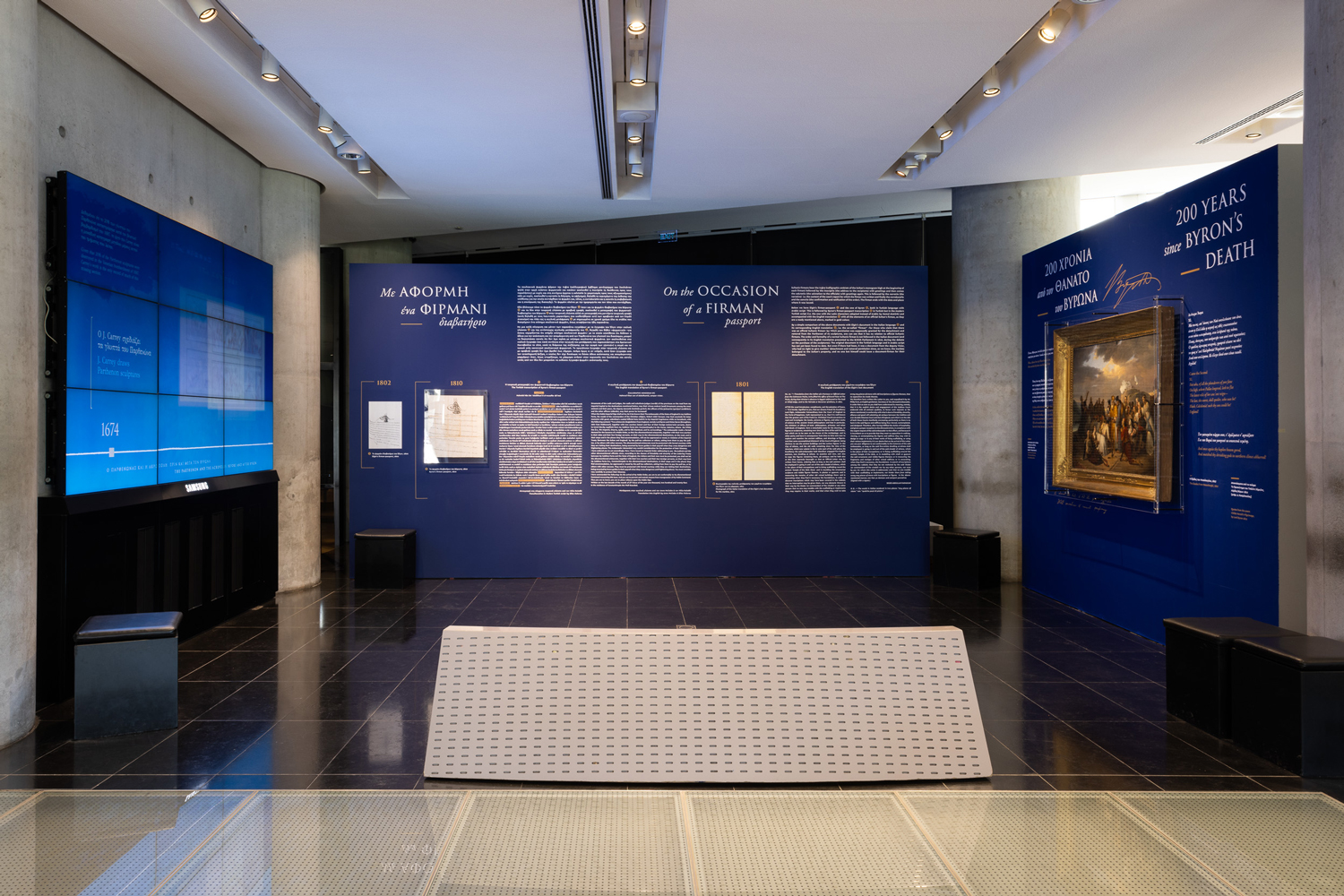 γ) το πρωτότυπο διαβατήριο του Βύρωνα, ένα αναπάντεχο πραγματικό επίσημο σουλτανικό έγγραφο που εκτίθεται για πρώτη φορά στο Μουσείο, με αφορμή το οποίο συζητείται εκ νέου η επιχειρηματολογία για την επιστροφή και επανένωση των γλυπτών του Παρθενώνα.