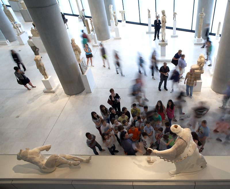 Natural light coming through the large windows and down from skylights in the roof creates the feeling of an open space and evokes the open-air atmosphere of the sanctuary on the Acropolis, where the ancient sculptures displayed here were originally erected.